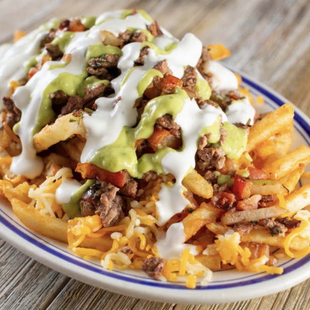 French fries, cheese, beans, diced tomatoes, onions, cilantro, chipotle mayo, guac, sour cream and your choice of meat. Choose one: CARNE ASADA, AL PASTOR, GRILLED CHICKEN, BIRRIA, CHORIZO, CARNITAS, VEGGIES